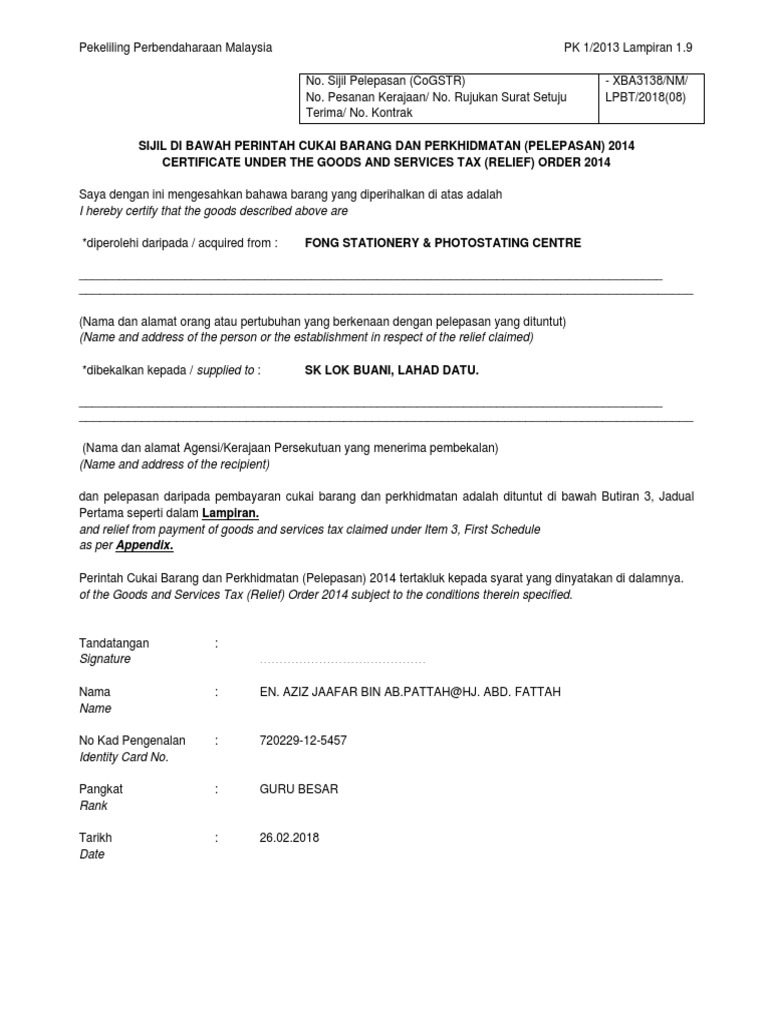 Borang pengecualian gst. Application for Certificate to Import Investment Precious Metal under Item 31 First schedule of GST. Pengecualian cukai jualan ke atas alat ganti dan bahan guna habis yang diimport atau dibeli daripada Gudang Pengilangan Berlesen Bonded Warehouse atau Zon Bebas di bawah Butiran 106 Perintah Cukai Jualan Pengecualian 2013. CERTIFICATE OF SCRAPWASTE DESTRUCTION.