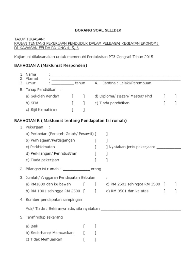 Contoh borang soal selidik pendapatan keluarga. A short summary of this paper. Download Full PDF Package. Borang soal selidik borang soal selidik kepuasan pelanggan borang soal selidik program borang soal.