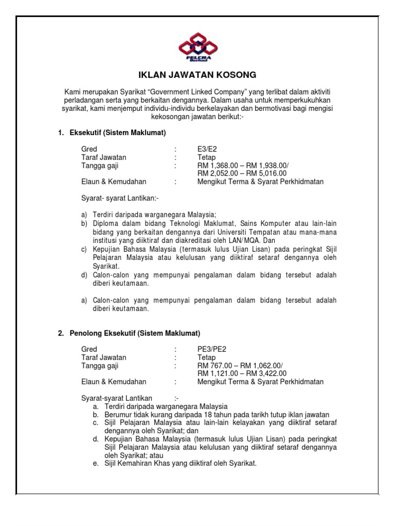 Jawatan Kosong Terkini Felcra Pelbagai Kekosongan Jawatan Kerja Kosong Kerajaan Swasta