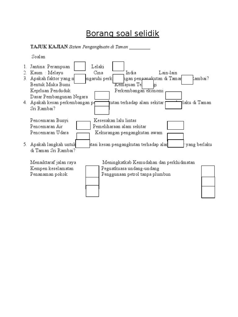 LAMPIRAN 4 Borang Soal Selidik Borang soal selidik ini akan digunakan untuk melaksanakan penyelidikan di bawah tajuk Keberkesanan Sistem Pengangkutan Awam di Bachok Kelantan.