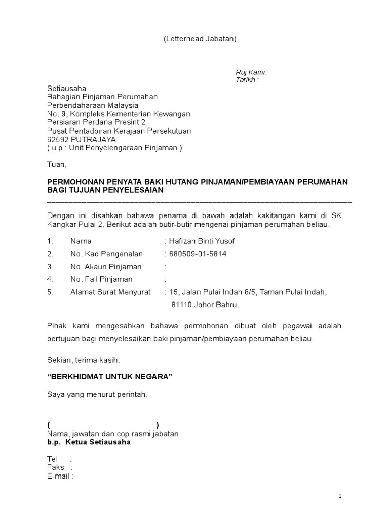 Borang Permohonan Penyata Baki Hutang Pembiayaan Perumahan Bagi Tujuan Penyelesaian Pdf